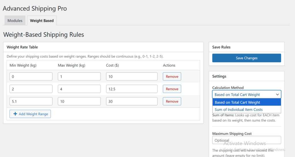 Most users buy Table Rate Shipping just to handle weight logic. Advanced Shipping Pro handles this natively.